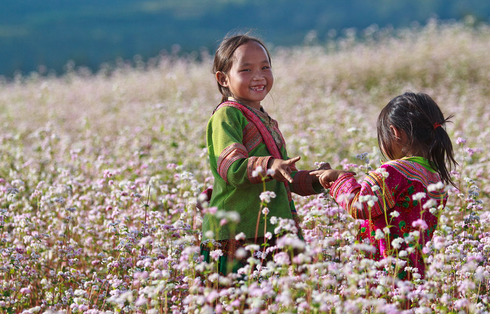 Đến thăm mùa hoa tam giác mạch, du khách còn thể bắt gặp những hình ảnh em bé dân tộc mông, chân trần, lưng đeo gù tre, tay dắt em nhỏ, ra đồng làm đỡ mẹ, hay những khuôn mặt ngây thơ, non nớt của các em bé ngủ gật trên lưng mẹ, miệng hơi nhoẻn cười như đang mơ một giấc mơ thật đẹp. Tiếng cười giòn tan, tinh nghịch của những đứa em trẻ thơ giữa những cánh đồng hoa tam giác mạch rộng lớn, cũng hết sức lạ lùng, tưởng lạ mà lại hết sức quen thuộc, khiến người du khách như trở về với thời thơ trẻ của nhiều năm về trước.