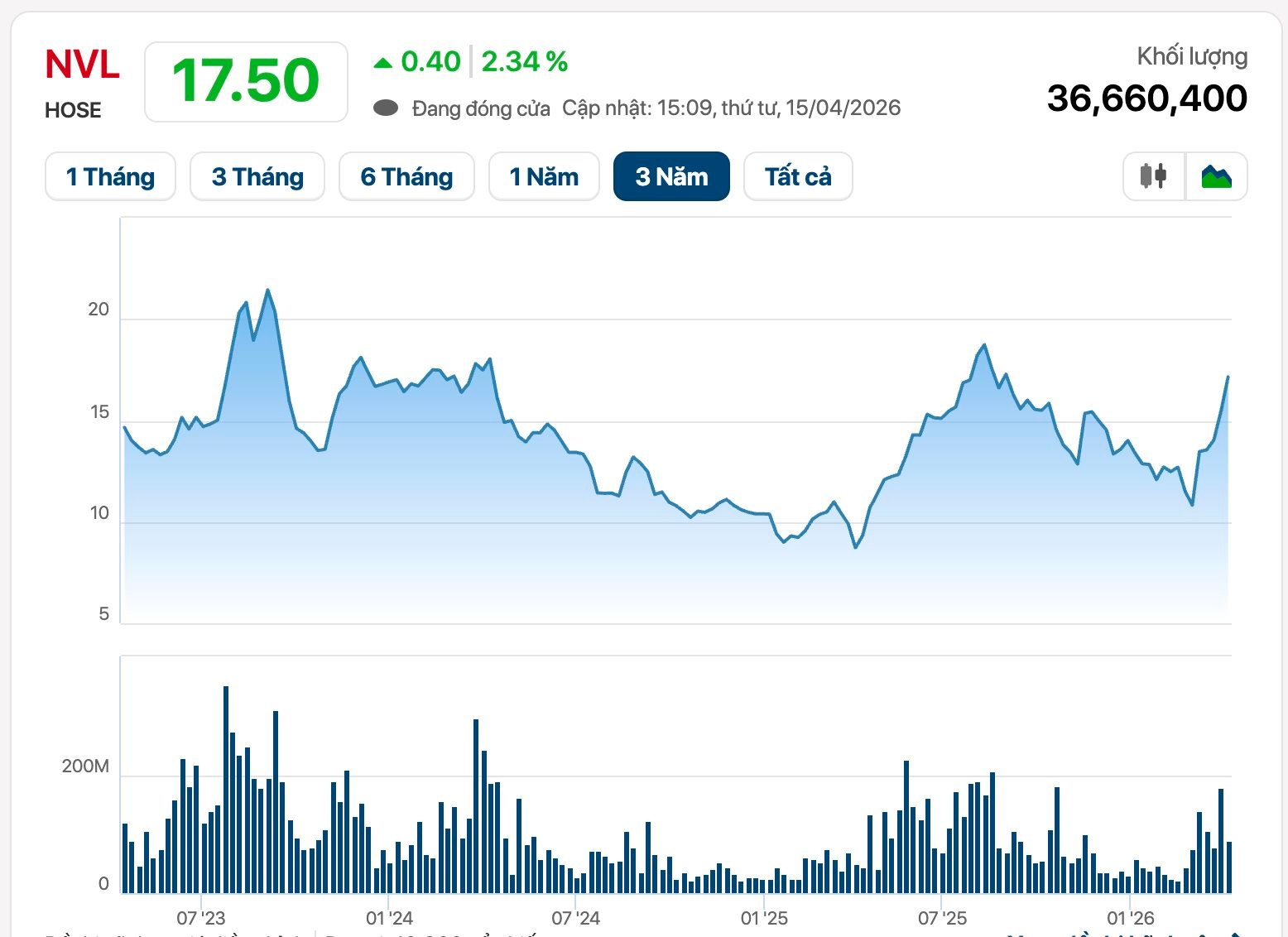 Trên thực tế, động thái bán ra chủ động và bị động của nhóm cổ đông trên ghi nhận trong bối cảnh thị giá NVL phục hồi khoảng 1 tháng trở lại đây. Chốt phiên 15/4, cổ phiếu NVL tăng hơn 2% lên mức 17.500 đồng/cp, tương ứng mức tăng gần 70% chỉ sau hơn 1 tháng.