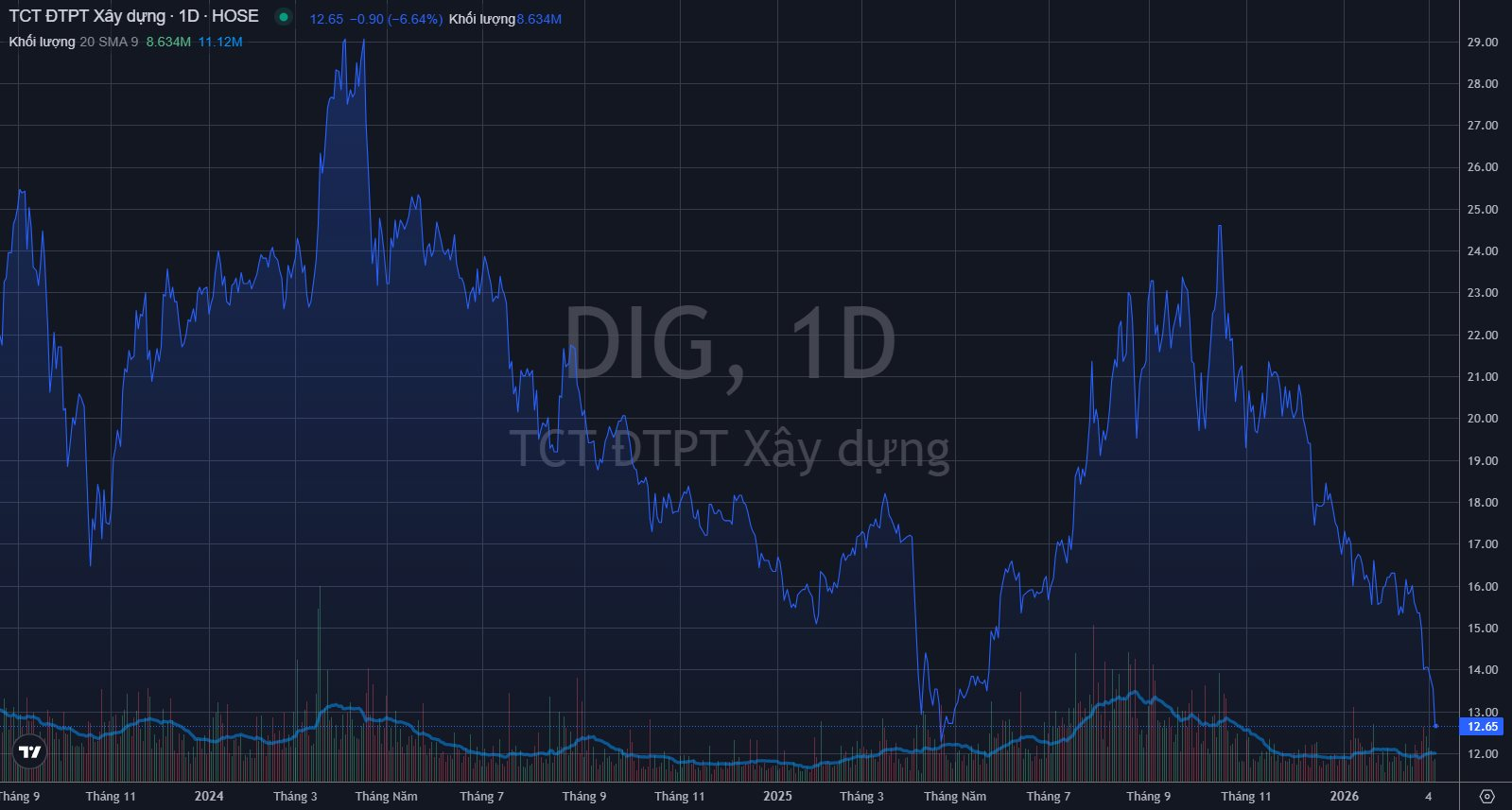 Trên thị trường, cổ phiếu DIG diễn biến không thực sự khả quan, thị giá trong xu hướng giảm giá xuyên suốt từ cuối năm 2025 cho tới hiện tại. Chốt phiên 6/3, giá DIG đạt 13.550 đồng/cp, giảm 19% so với đầu năm 2026. Sang tới phiên 9/2, thị giá tiếp tục giảm sàn xuống 12.650 đồng/cp giữa áp lực bán lan rộng.